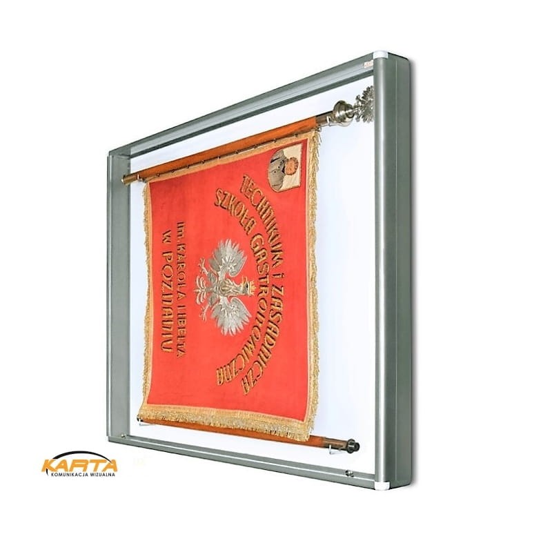 Gablota na sztandar wykonana z w całości z aluminium anodowanego na srebrno lub malowanego na złoto, zabezpieczone lakierem bezbarwnym przed czernieniem. Narożniki gabloty plastikowe. Drzwi - bezpieczne szkło akrylowe w ramie aluminiowej unoszone do góry, zamykane na dwa zamki. Tło białe. W zestawie haki do zamontowania sztandaru z drzewcem i drugiej części drzewca. Głębokość 13cm, przestrzeń użytkowa 10cm.