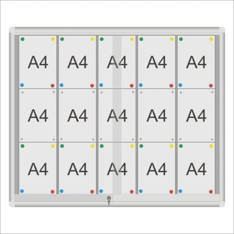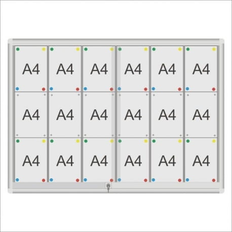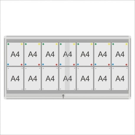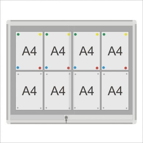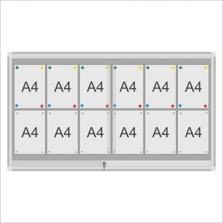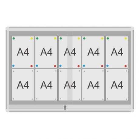 Gablota ogłoszeniowa GCS z drzwiami przesuwnymi przeznaczona do użytku w szkołach, urzędach, wspólnotach mieszkaniowych i innych instytucjach. Drzwi przesuwne na rolkach mosiężnych, osadzonych w profilu, zamykane zamkiem patentowym. Gablota dostępna w dwóch rodzajach podkładów magnetycznych: biały lub srebrny. Za dopłatą możliwa jest własna konfiguracja gabloty pod względem wymiaru i koloru.