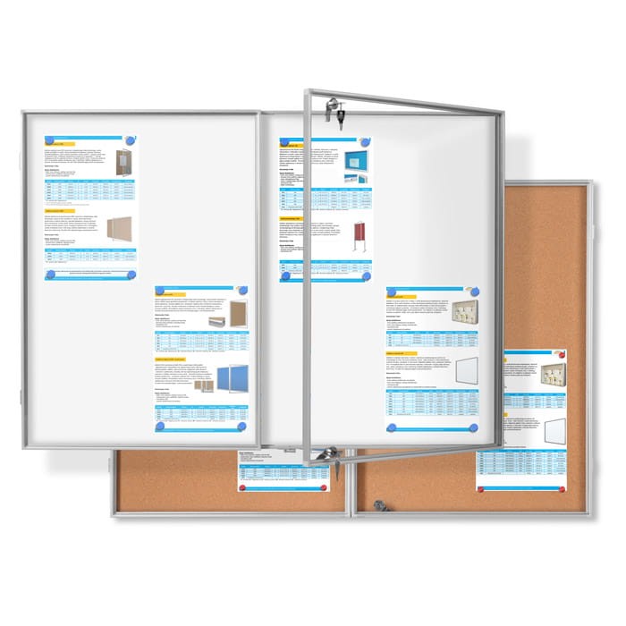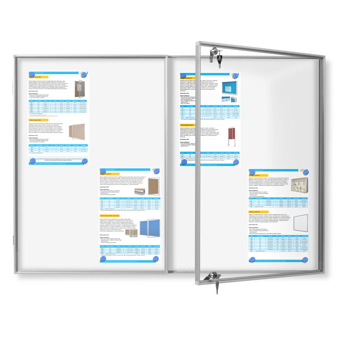 Gabloty do ogłoszeń. Gablota ogłoszeniowa dwudrzwiowa GMD wykonana z bezpiecznego szkła akrylowego. Rama gabloty aluminiowa anodowana w kolorze srebrnym, narożniki plastikowe. Dwoje uchylnych drzwi zamykanych na dwa zamki.