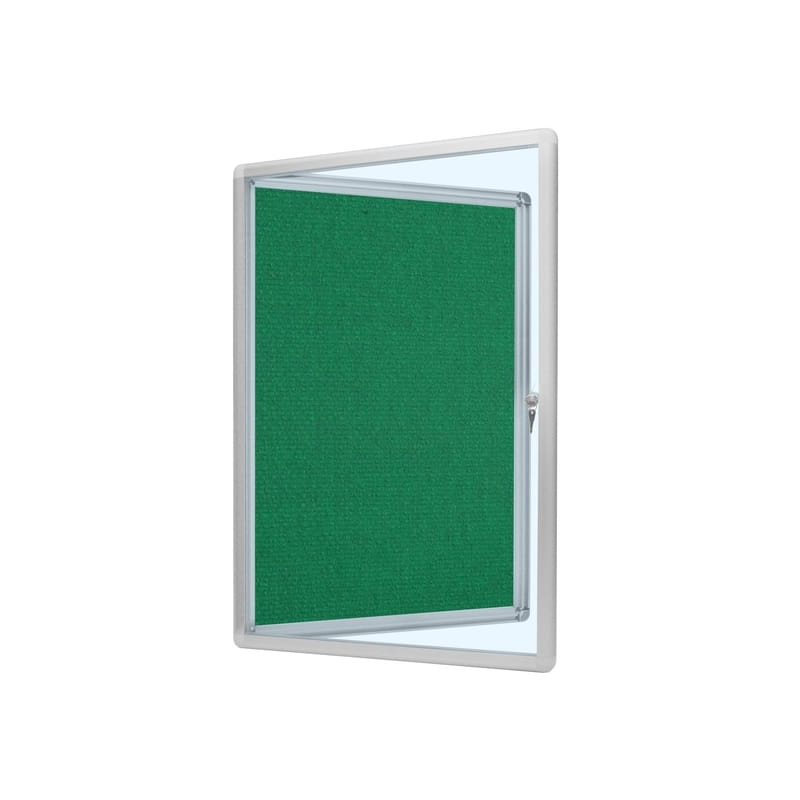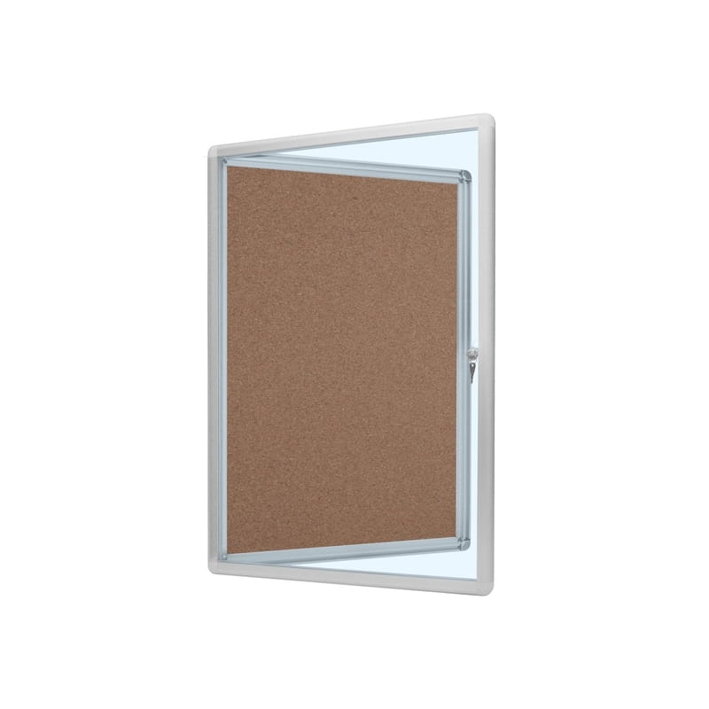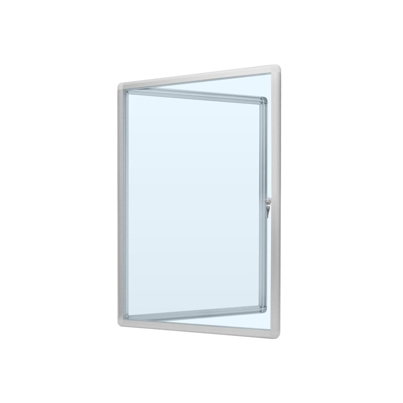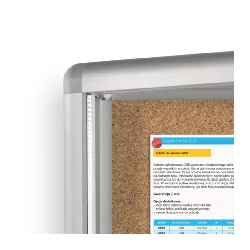 Gablota ogłoszeniowa GO jednodrzwiowa przeznaczona do użytku w szkołach, urzędach, wspólnotach mieszkaniowych i innych instytucjach. Gablota wykonana z owalnych profili aluminiowych anodowanych na srebrno z plastikowymi narożnikami. Drzwi wykonane bezpiecznego szkła akrylowego zamykane na dwa zamki. Zawiasy montowane na dłuższym boku. Możliwość wieszania w pionie lub poziomie. Gablota dostępna w sześciu wersjach podłoża: magnetyczne białe oraz do wpinania (korek, zielone, niebieskie, czerwone, szare). Za dopłatą możliwa jest własna konfiguracja gabloty pod względem wymiaru i koloru.