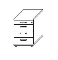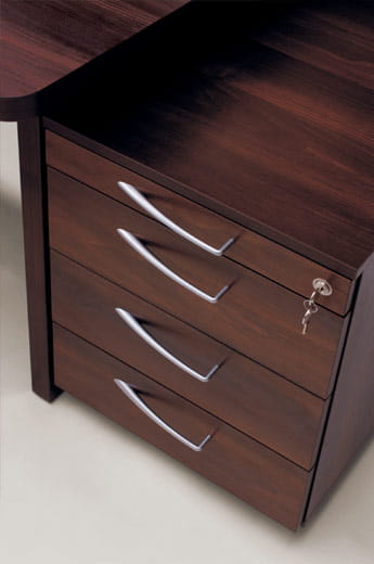Trzy szuflady plus piórnik, metalowe wkłady szuflad, zamek centralny.