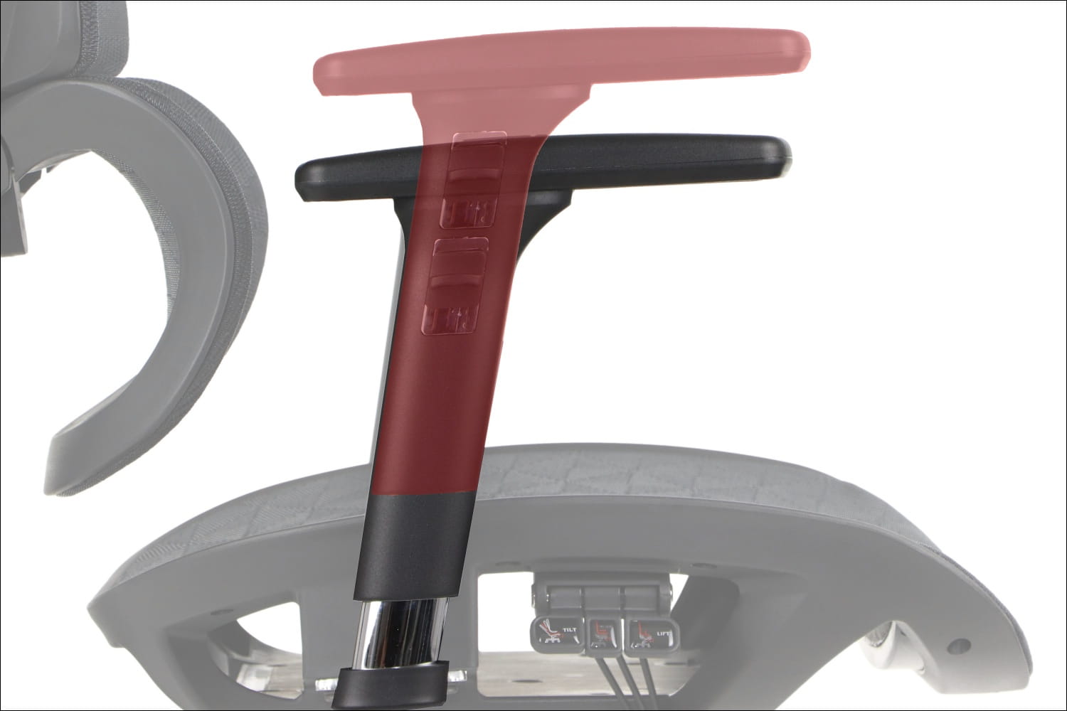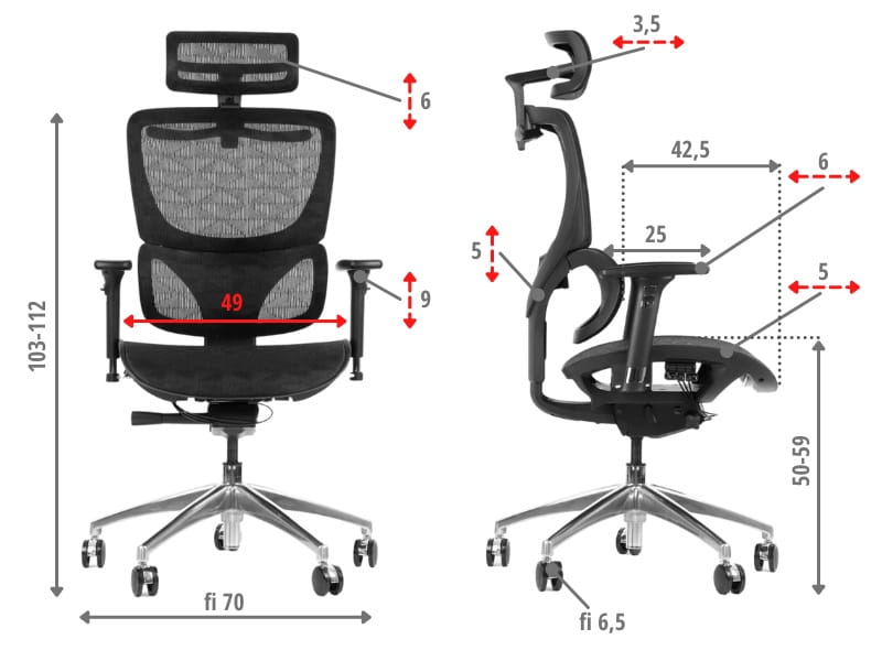 Regulacja wysokości, odchyłu i wysuwu siedziska jest intuicyjna i wygodna dzięki umieszczonym przy siedzisku przyciskom. To umożliwia błyskawiczne dostosowanie fotela do indywidualnych potrzeb oraz zapewnia optymalną pozycję podczas pracy.