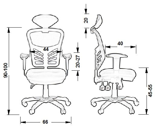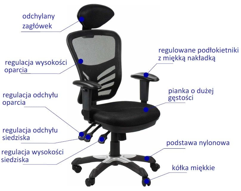 -niezależna regulacją kąta odchylenia oparcia, wysokości oparcia i kąta odchylenia siedziska,