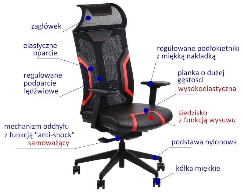 - Funkcja "anti-shock" - po zwolnieniu blokady oparcie fotela nie uderza w plecy