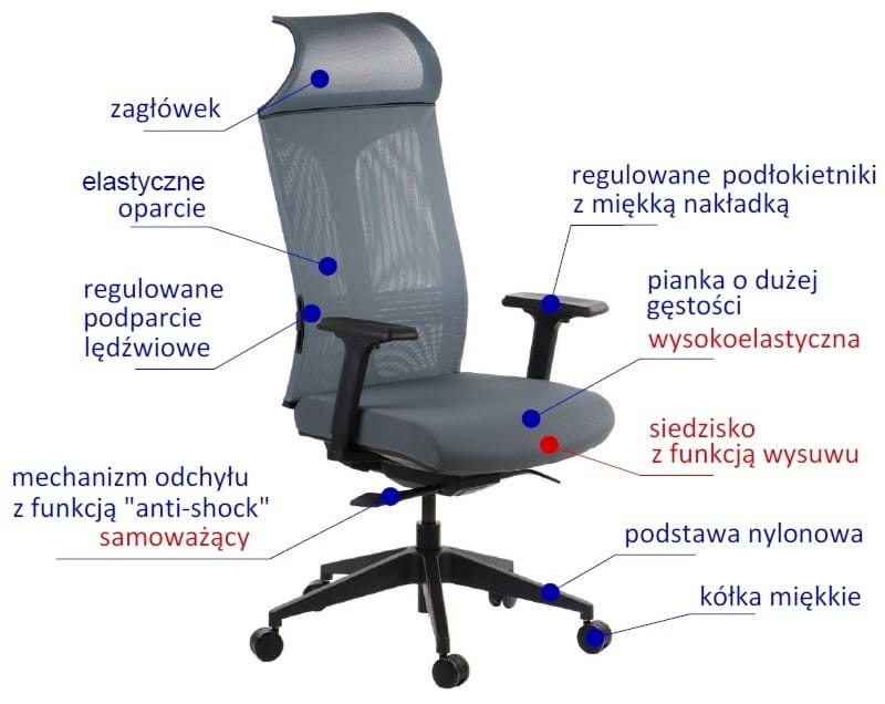 - Funkcja "anti-shock" - po zwolnieniu blokady oparcie fotela nie uderza w plecy