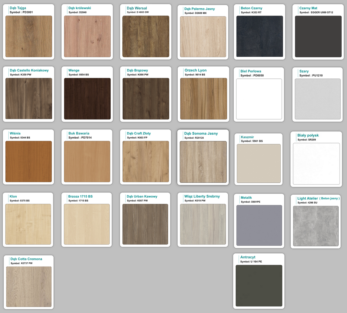 - płyta melaminowana i płyta HPL, możliwe kolory do wyboru z palety kolorów.