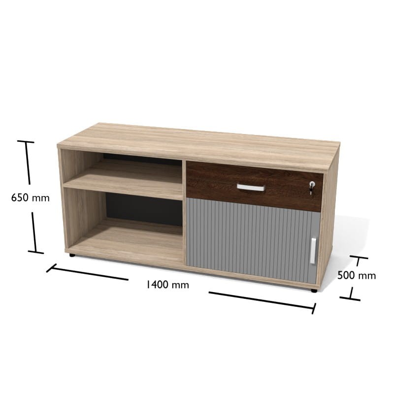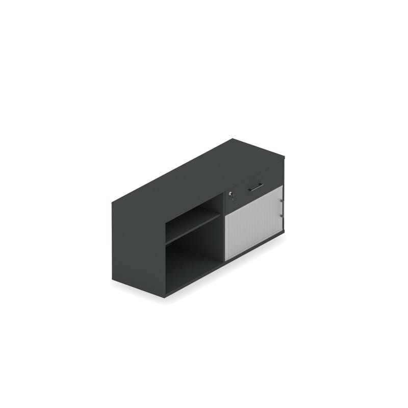 - Pomocnik wyposażony jest w standardzie w szuflady, pojedyncze drzwi żaluzjowe, półkę i pojedynczą przestrzeń segregatorową,