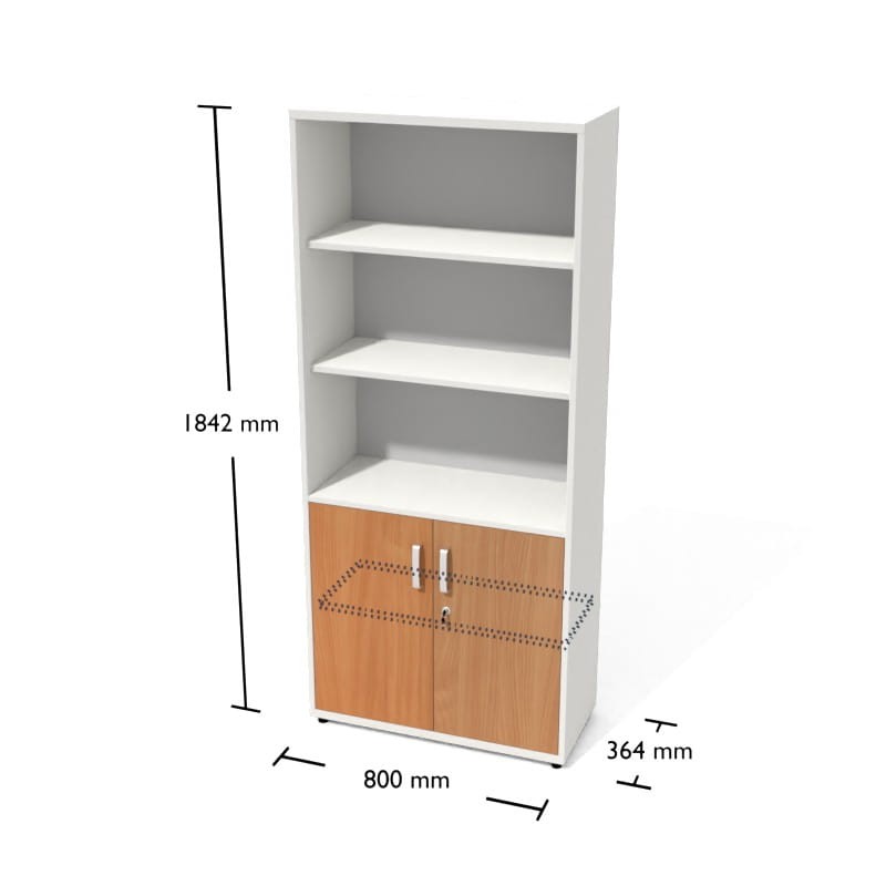 - regał wysoki, szeroki, dół zamknięty z 1-ną półką, góra otwarta z 3-ma półkami.