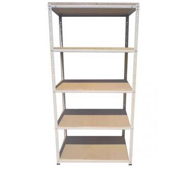 Regały skręcane śrubami M8 (zaczepowe na zapytanie) z półkami wiórowymi.