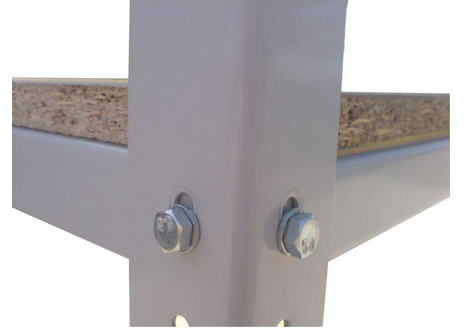 Standardowo półka o nośności 100kg wykonana z płyty wiórowej o grubości 1,6cm, oparta na wspornikach 0,8cm; nogi o profilu 35x35mm o grubości 1,5mm.