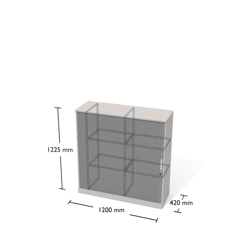 Regał żaluzjowy Wgsaz4 o wymiarach: 120x42x122,5cm (dł. x szer. x wys.) w kolorze Grafit/Biały. Regał posiada 3 przestrzenie segregatorowe z drzwiami żaluzjowymi wyposażonymi we wpuszczane uchwyty muszelkowe. Żaluzja otwiera się od prawej strony.