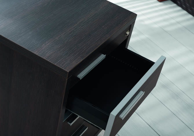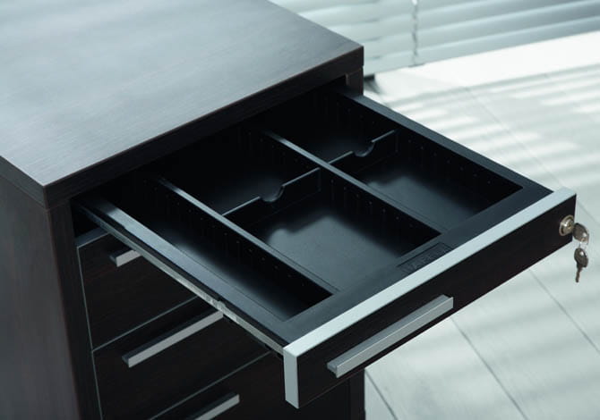 Kontener i pomocniki posiadają piórnik oraz metalowe wkłady szuflad. Szafy i komody mogą być wykonane z drzwiami z płyty lub jako ramki aluminiowe wypełnione szkłem LACOBEL w kolorze szary metal.