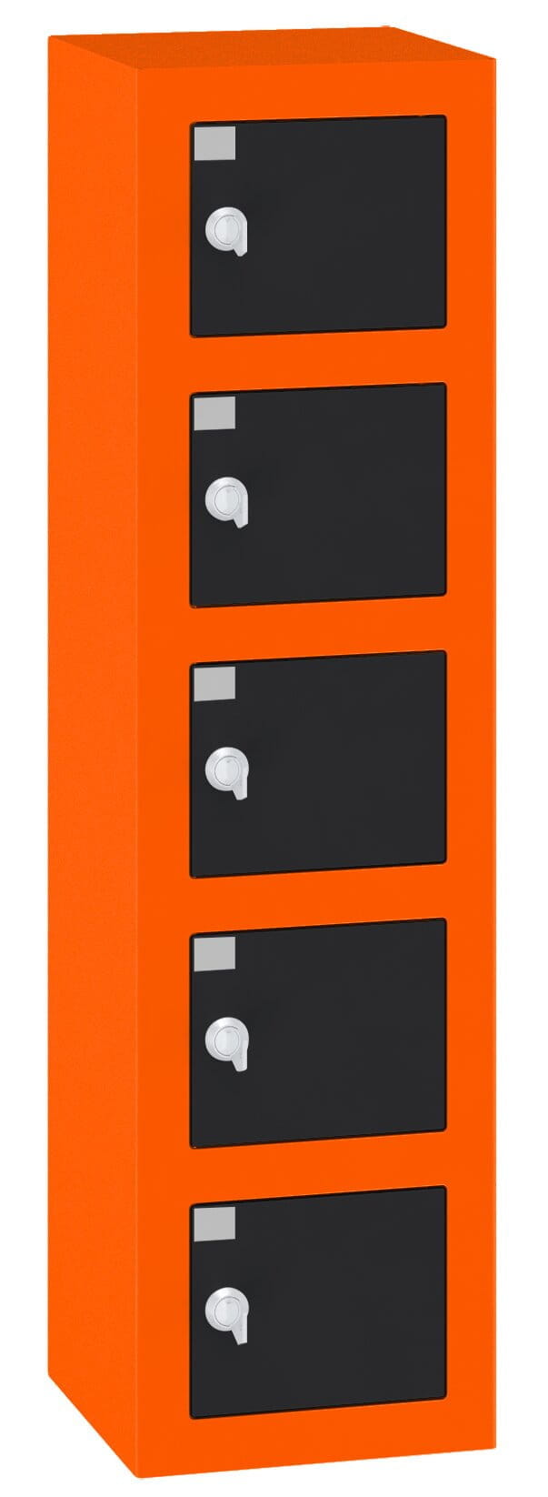 5-skrytkowa szafka do przechowywania telefonów komórkowych. Każda skrytka ma swój oddzielny zamek.