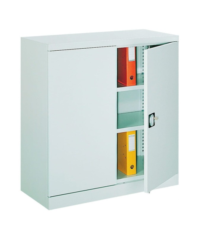 Szafka metalowa zamykana na klucz, ma wieniec szafy wykonany z blachy stalowej o gr.0,8 mm, wieniec dolny z blachy ocynkowanej. Pozostałe elementy korpusu z blachy 0,6 mm. Drzwi skrzydłowe ze schowanymi zawiasami z blachy o gr.0,8 mm. Uchwyt drzwiowy z zamkiem zabezpieczającym. Szafa posiada przestawne co 25 mm półki o gr. 0,8 mm dostosowane do teczek zawieszkowych.