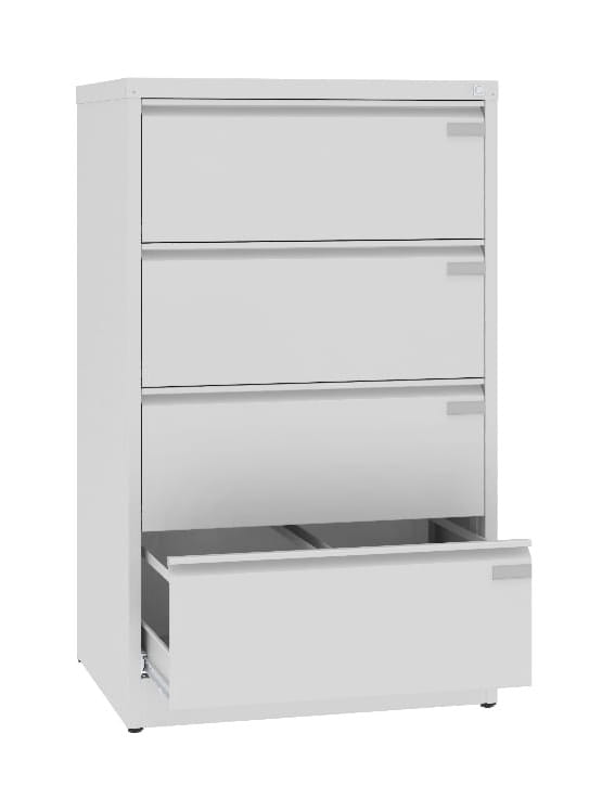 Korpus szafki wykonany z blachy stalowej gr. 0,8-1,5mm, fronty szuflady z blachy gr. 1,0mm, pozostałe części szuflad z blachy gr. 0,6mm. Szuflada przystosowana na dwa rzędy teczek zawieszkowych (format A4 poziomo) na prowadnicach kulkowych o podwójnym wysuwie i z zabezpieczeniem przed wypadaniem. Centralne ryglowanie szuflad. Maksymalne obciążenie szuflady 50kg.