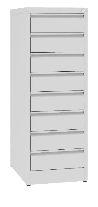 Szafka przystosowana do przechowywania alfabetycznych i osobowych. Korpus szafki wykonany z blachy stalowej gr. 1,0 mm, fronty szuflady z blachy gr. 1,0mm, pozostałe części szuflad z blachy gr. 0,8mm. Szuflada przystosowana na pięć rzędów kartotek na prowadnicach kulkowych o podwójnym wysuwie i z zabezpieczeniem przed wypadaniem. Centralne ryglowanie szuflad. Maksymalny wymiar przechowywanego dokumentu 130x72mm. Maksymalne obciążenie szuflady 50kg.