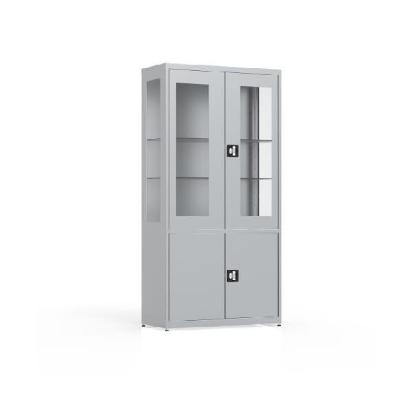 Szafa medyczna, dwudzielna. Część górna posiada dwa przeszklone szkłem hartowanym skrzydła drzwi uchylnych, zawieszone na zawiasach kołkowych, przeszklone boki oraz dwie półki wykonane ze szkła hartowanego o maksymalnym udźwigu 25kg. Część dolna wyposażona jest w jedną szklaną półkę zamykaną pełnymi drzwiami uchylnymi. Drzwi zamykane są zamkiem baskwilowym, ryglującym w trzech punktach i wykończone są uchwytem klamkowym. Szafa osadzona jest na regulowanych stopkach. MDBW/2 wykonana jest z blachy czarnej o grubości 0,8-1mm. Malowana jest farbami proszkowymi (epoksydowo-poliestrowymi) w kolorze RAL7035 (jasny popiel).