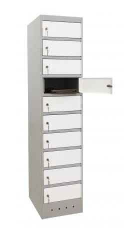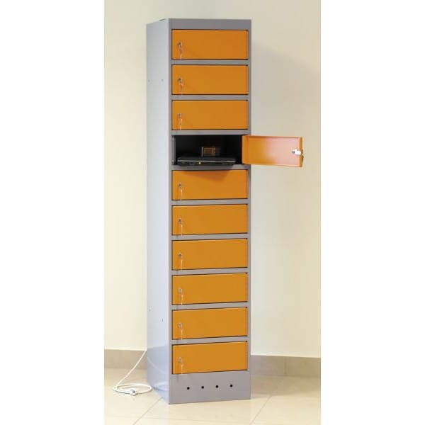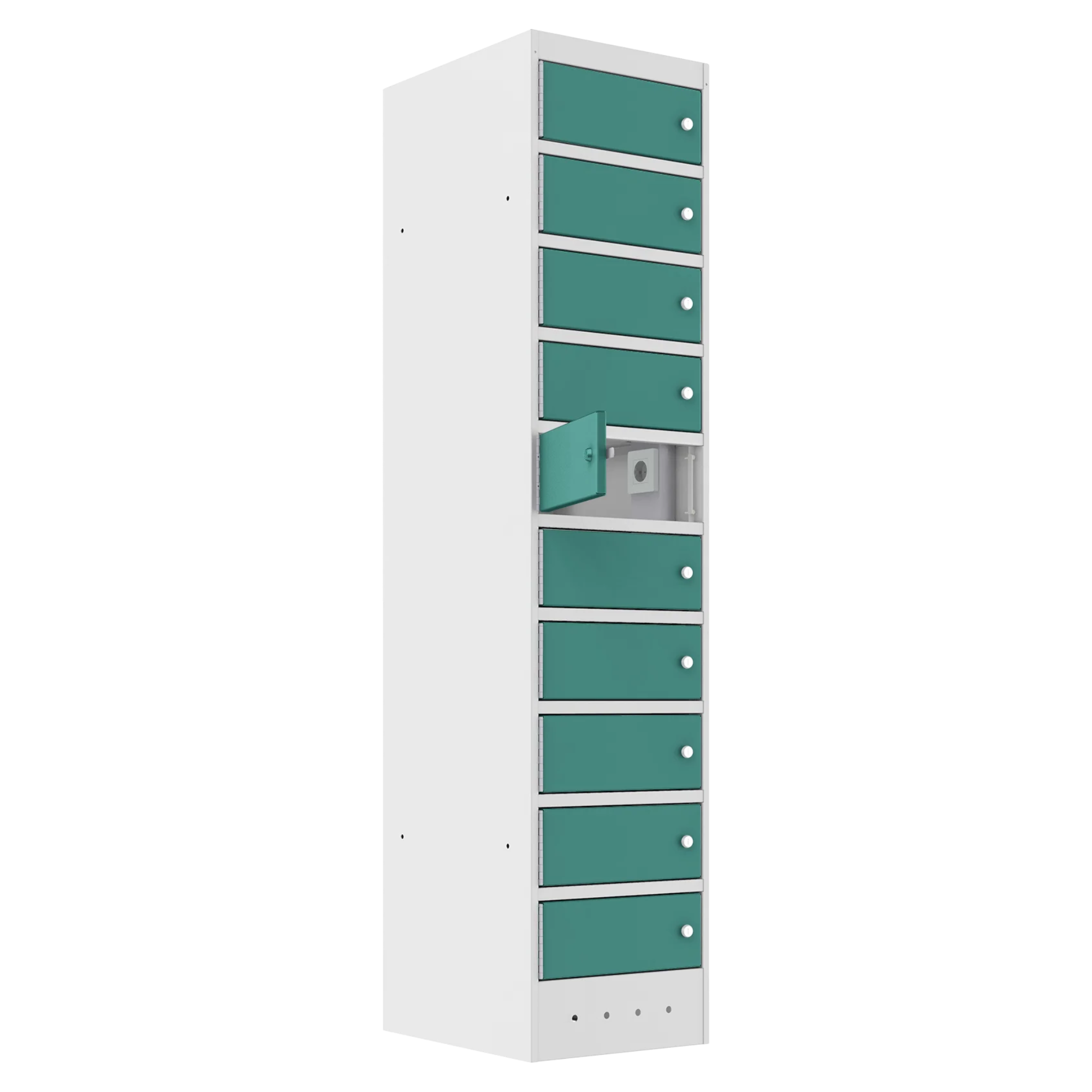 Posiada 10 niezależnych skrytek, każda zamykana osobnym zamkiem cylindrycznym z blokadą w jednym punkcie, co gwarantuje maksymalne bezpieczeństwo przechowywanych urządzeń. W wersji z instalacją elektryczną każda skrytka wyposażona jest w gniazdo 230 V, a na życzenie dostępne są warianty z dodatkowymi portami USB A i C, umożliwiającymi ładowanie również tabletów i smartfonów.
