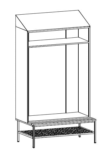 Zestawy szatniowy SZOS 5 składa się z otwartego przedziału na ubrania z drążkiem oraz półką nad nim. W skład zestawu wchodzi również podstawa metalowa z listwami drewnianymi z perforowaną półką na buty oraz daszek na górze szafy.