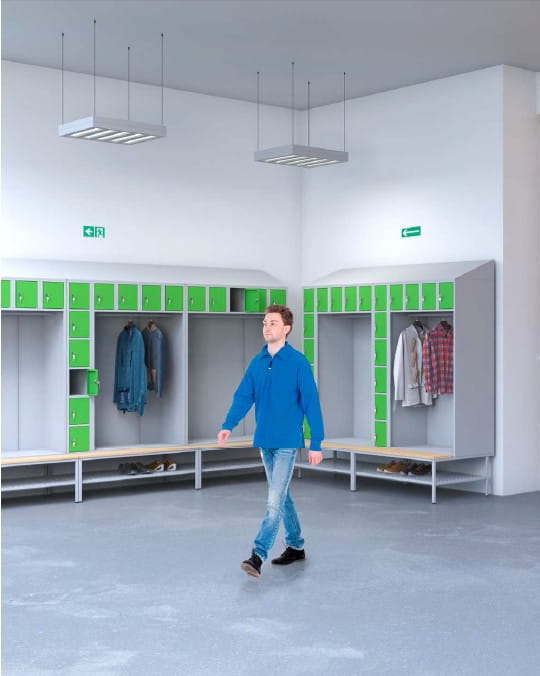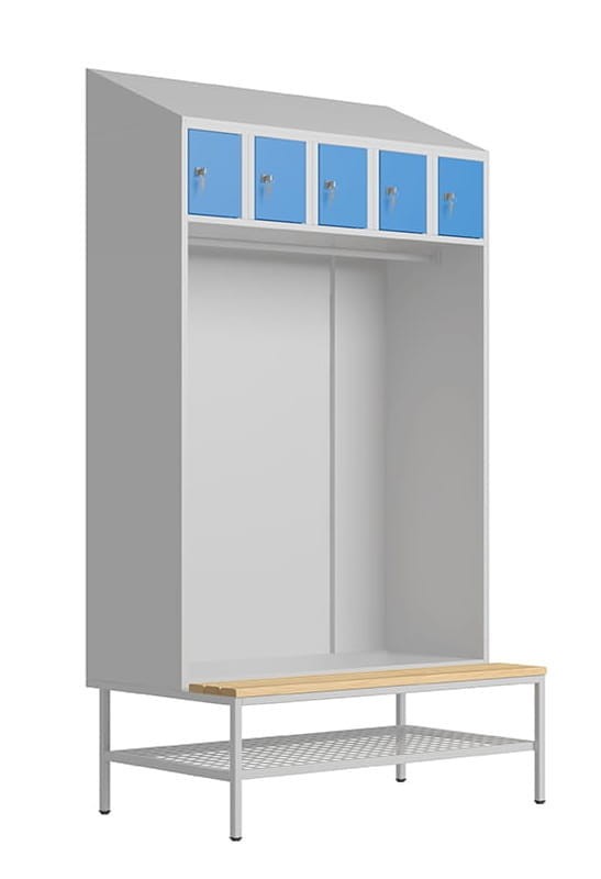 Zestawy szatniowy SZOS 5 składa się z otwartego przedziału na ubrania z drążkiem oraz pięciu skrytek nad nim. W skład zestawu wchodzi również podstawa metalowa z listwami drewnianymi z perforowaną półką na buty oraz daszek na górze szafy. Każda nasza szafka ubraniowa bhp, to gwarancja najwyższej jakości wykonania!