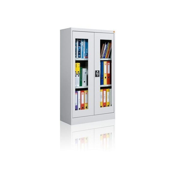 Szafa witrynowa posiada dwa skrzydła drzwi uchylnych, zawieszonych na zawiasach kołkowych. Wykonana jest z blachy czarnej o grubości 0,8-1 mm. Drzwi szafy posiadają przeszklenie wykonane z szyby hartowanej, zamykane są zamkiem baskwilowym, ryglującym w trzech punktach i wykończonym uchwytem klamkowym. Szafa wyposażona jest w dwie metalowe półki. Całość malowana jest farbami proszkowymi (epoksydowo-poliestrowymi) w kolorze RAL7035 (jasny popiel).