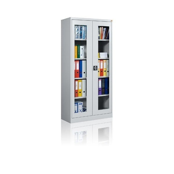 Szafa witrynowa posiada dwa skrzydła drzwi uchylnych, zawieszonych na zawiasach kołkowych. Wykonana jest z blachy czarnej o grubości 0,8-1 mm. Drzwi szafy posiadają przeszklenie wykonane z szyby hartowanej, zamykane są zamkiem baskwilowym, ryglującym w trzech punktach i wykończonym uchwytem klamkowym. Szafa wyposażona jest w cztery metalowe półki. Całość malowana jest farbami proszkowymi (epoksydowo-poliestrowymi) w kolorze RAL7035 (jasny popiel).
