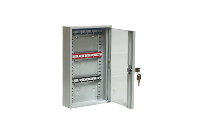Szafka metalowa SKR-15/S z haczykami na ruchomych listwach na 15szt. kluczy z drzwiami szklanymi wykonanymi z bezpiecznego szkła hartowanego o grubości 4mm.