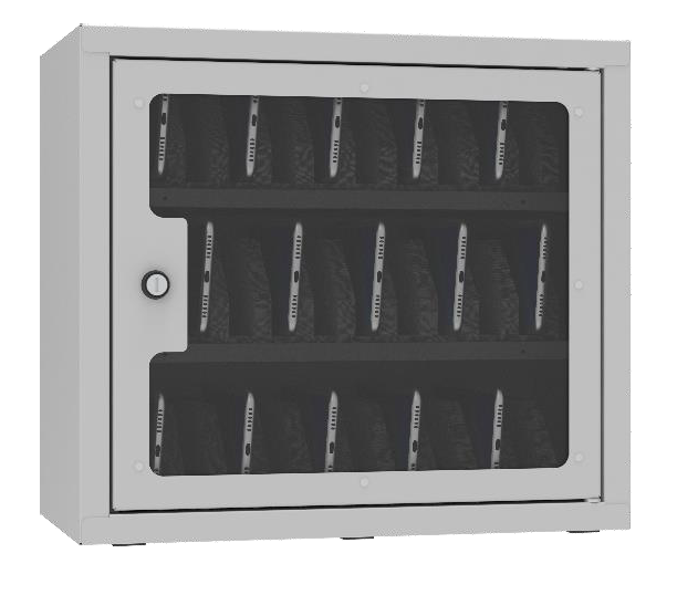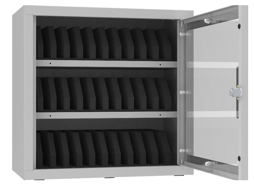- Wyposażenie: pojemność na 30 telefonów, 2 stałe półki, wkłady z pianki elektrostatycznej (antracyt) na telefony, zamek cylindryczny w systemie master (2 klucze), otwory montażowe i zestaw montażowy