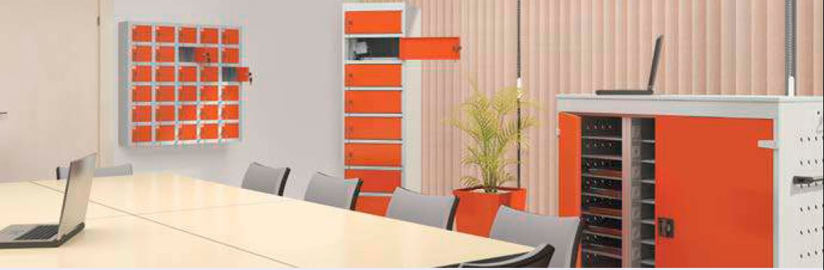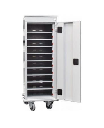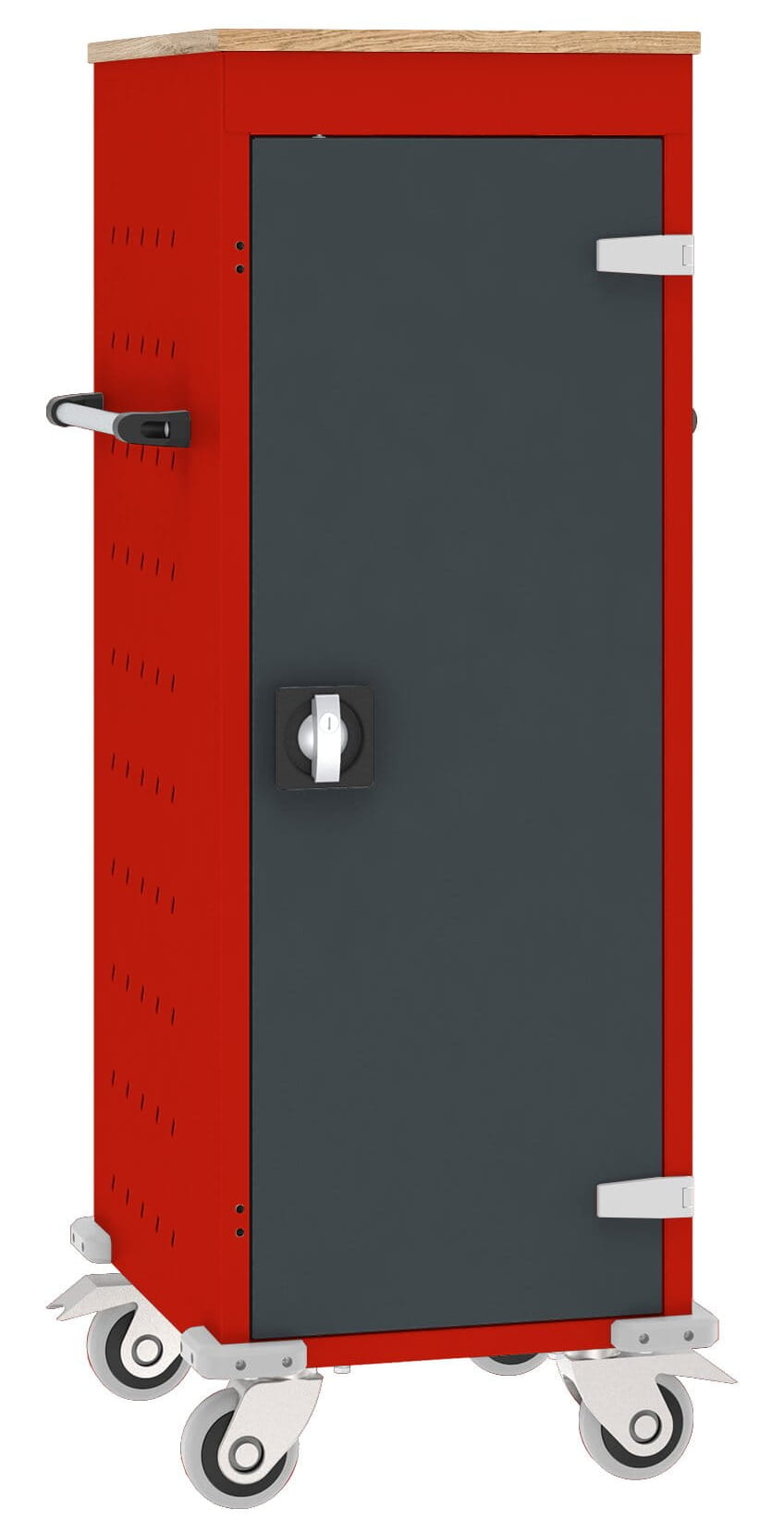 Drzwi szafy zamykane zamkiem zabezpieczającym z blokadą w dwóch punktach. Wierzch wózka pokryty blatem z melaminy gr. 18 mm, klasa higieniczności E1. Korpus wózka posiada otwory wentylacyjne do cyrkulacji powietrza (chłodzenie ładujących się laptopów). Maksymalny wymiar przestrzeni roboczej 96 x 340 x 470 mm (17´). Korpus wózka wykonany z blachy stalowej malowanej farbami proszkowymi poliestrowo-epoksydowymi.
