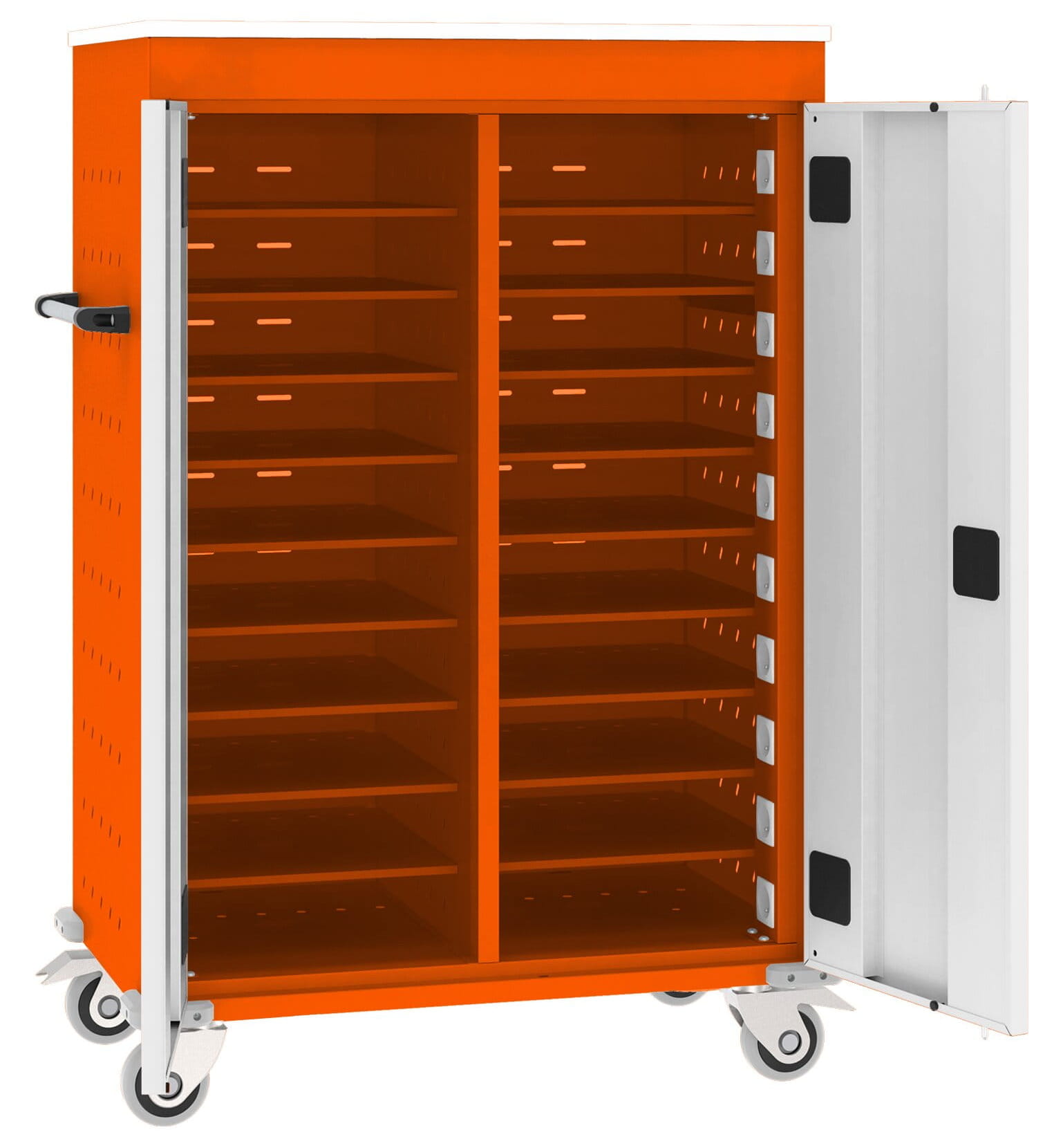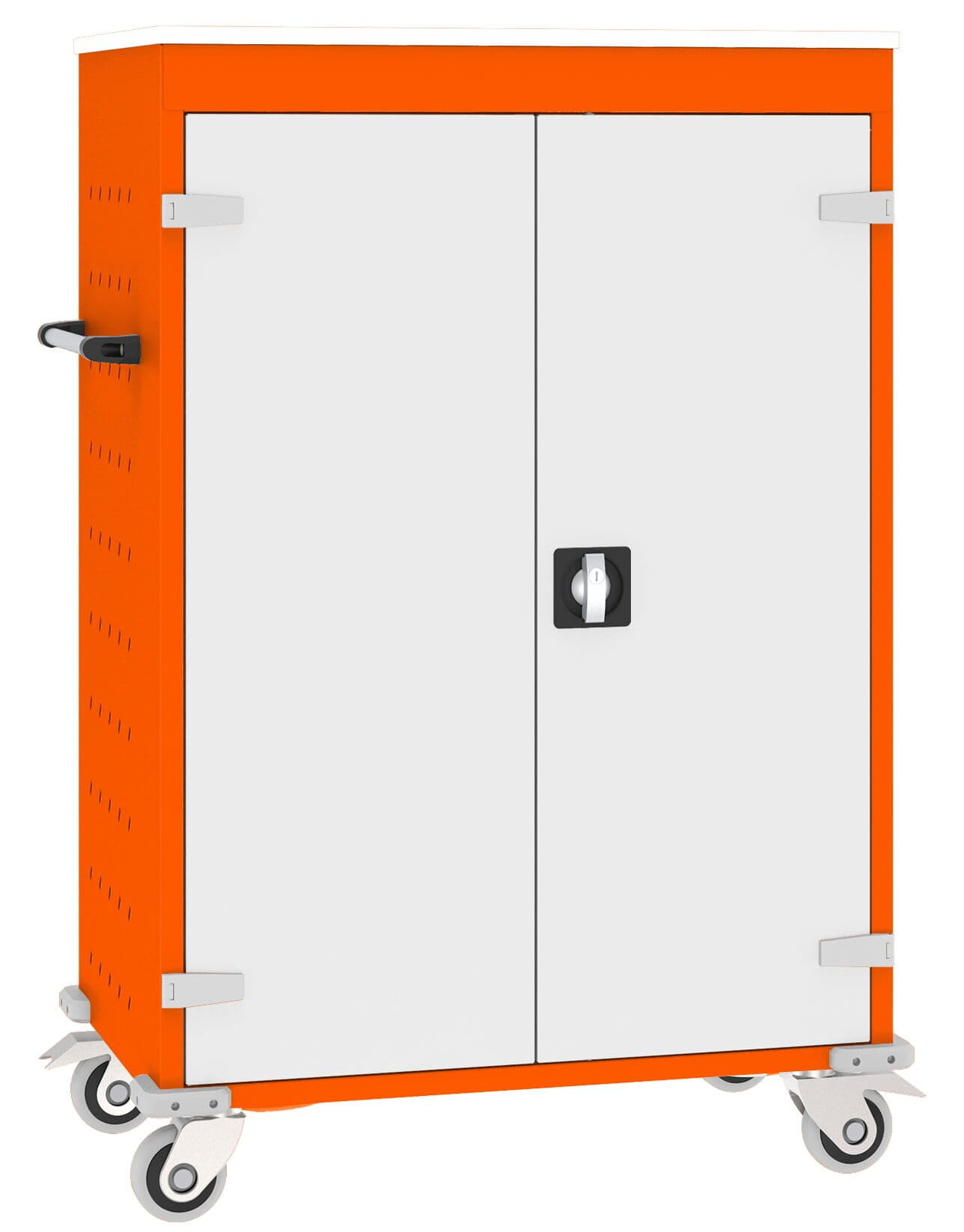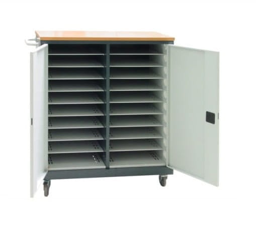 Drzwi szafy zamykane zamkiem zabezpieczającym z blokadą w dwóch punktach. Wierzch wózka pokryty blatem z melaminy gr. 18 mm, klasa higieniczności E1. Korpus wózka posiada otwory wentylacyjne do cyrkulacji powietrza (chłodzenie ładujących się laptopów). Maksymalny wymiar przestrzeni roboczej 96 x 340 x 470 mm (17´). Korpus wózka wykonany z blachy stalowej malowanej farbami proszkowymi poliestrowo-epoksydowymi.