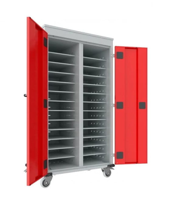 Drzwi szafy zamykane zamkiem zabezpieczającym z blokadą w dwóch punktach. Wierzch wózka pokryty blatem z melaminy gr. 18 mm, klasa higieniczności E1. Korpus wózka posiada otwory wentylacyjne do cyrkulacji powietrza (chłodzenie ładujących się laptopów). Maksymalny wymiar przestrzeni roboczej 96 x 340 x 470 mm (17´). Korpus wózka wykonany z blachy stalowej malowanej farbami proszkowymi poliestrowo-epoksydowymi.