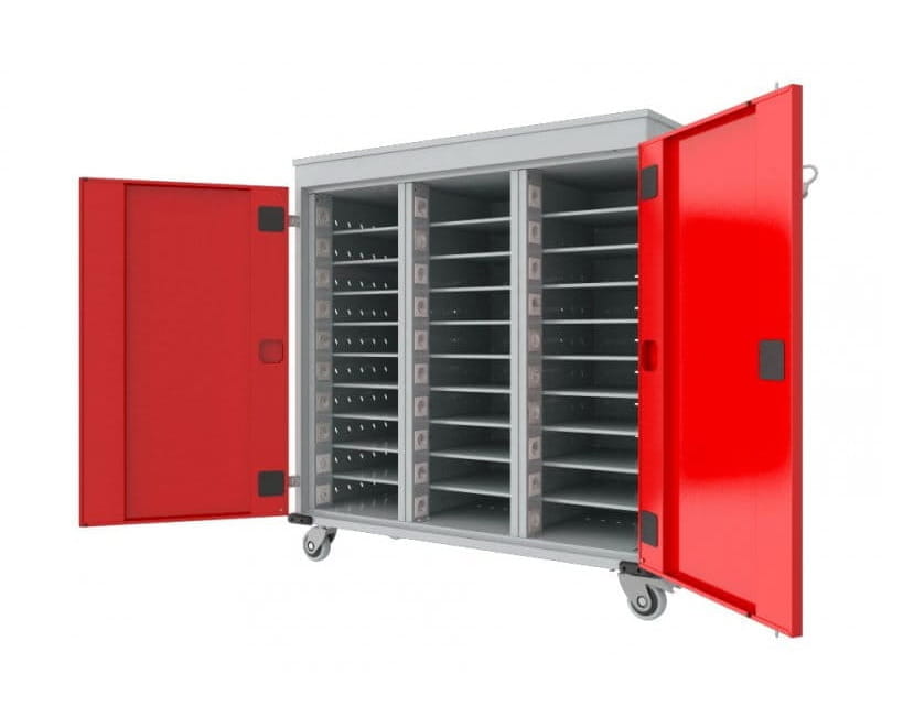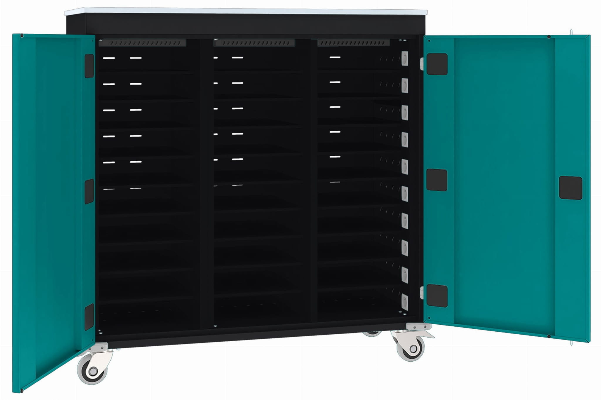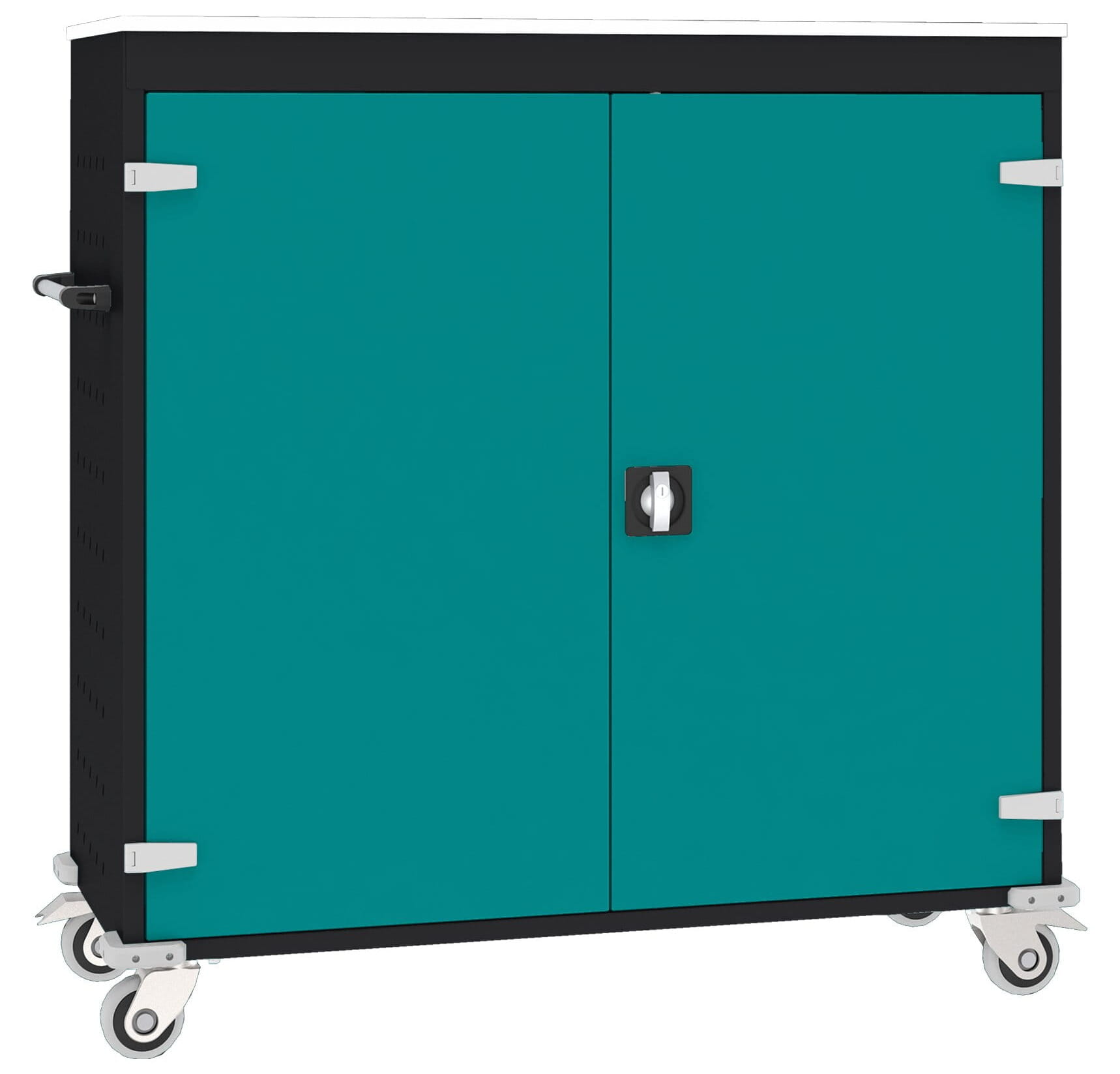 Drzwi szafy zamykane zamkiem zabezpieczającym z blokadą w dwóch punktach. Wierzch wózka pokryty blatem z melaminy gr. 18 mm, klasa higieniczności E1. Korpus wózka posiada otwory wentylacyjne do cyrkulacji powietrza (chłodzenie ładujących się laptopów). Maksymalny wymiar przestrzeni roboczej 96 x 340 x 470 mm (17´). Korpus wózka wykonany z blachy stalowej malowanej farbami proszkowymi poliestrowo-epoksydowymi.