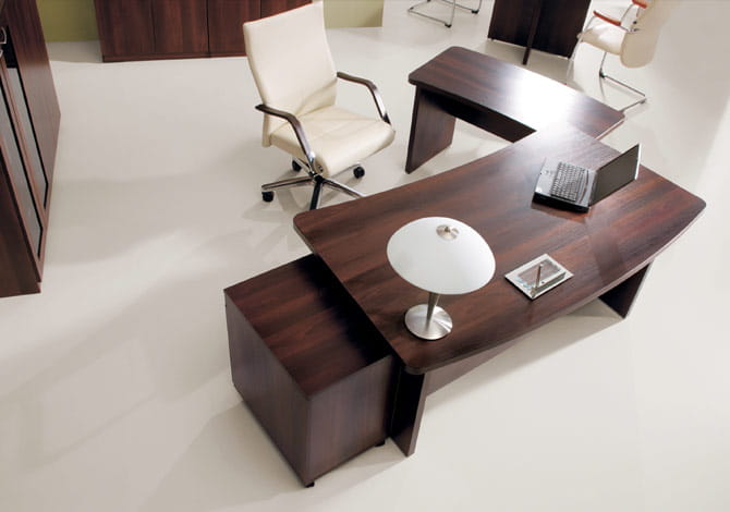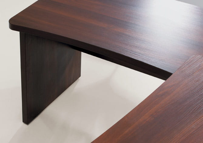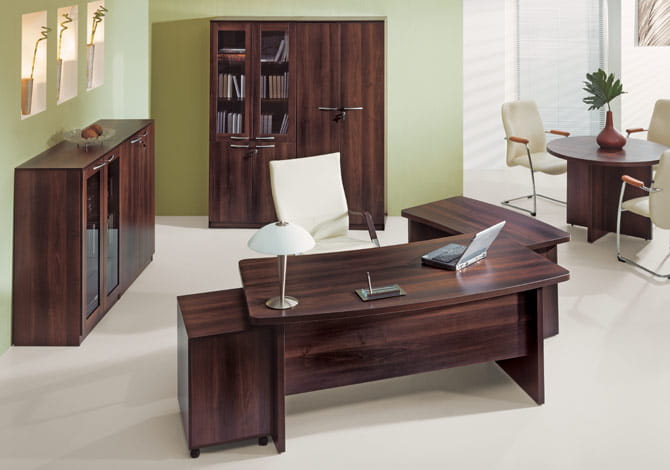 Zestaw składa się z solidnych, masywnych biurek, szaf, regałów, przeszklonych witryn, kontenera oraz stołów konferencyjnych. Masywne blaty i starannie dobrane, eleganckie wykończenia dają wrażenie powagi i prestiżu.